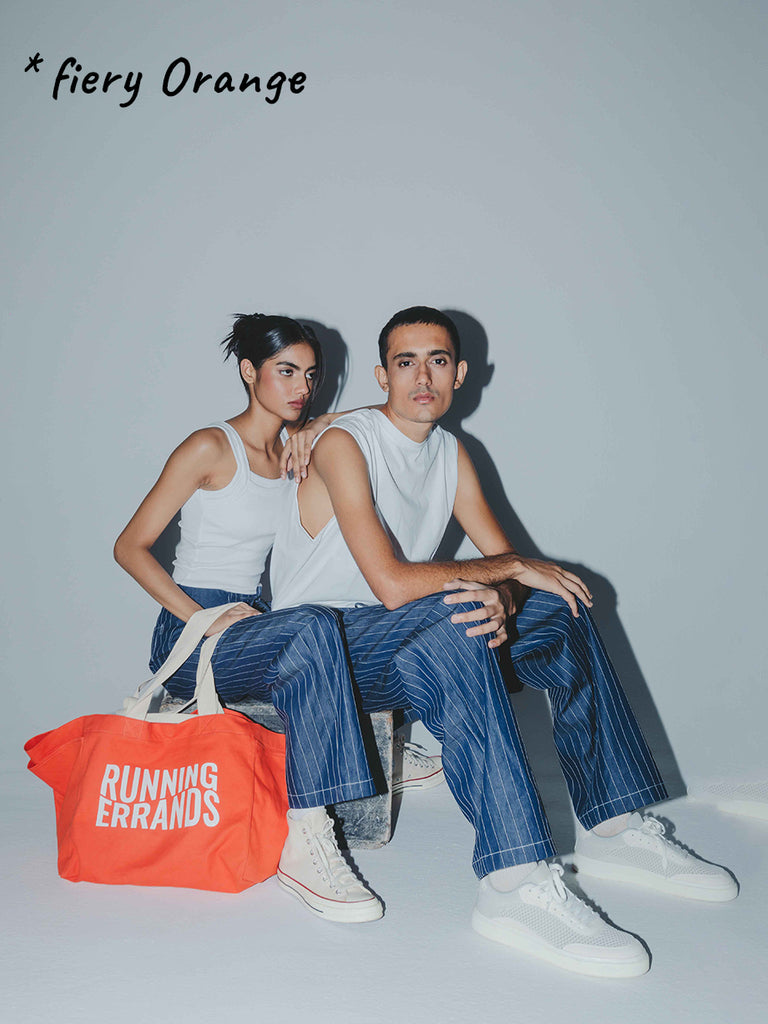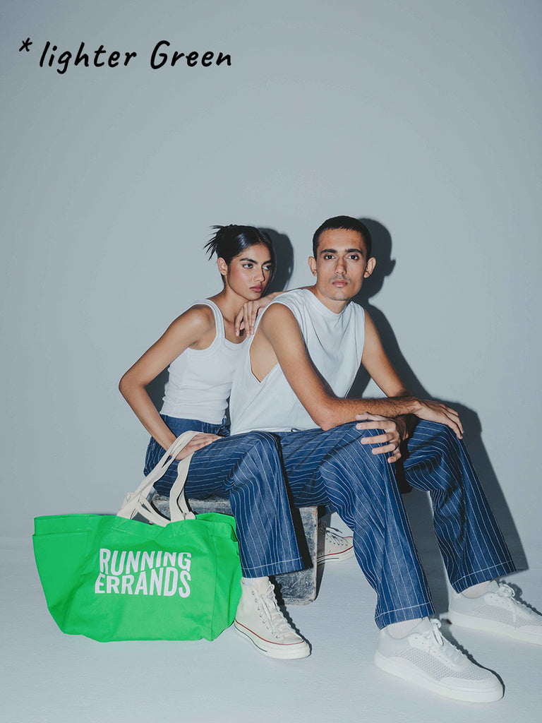 — "RUNNING ERRANDS" graphic jhola available in lighter Green & fiery Orange