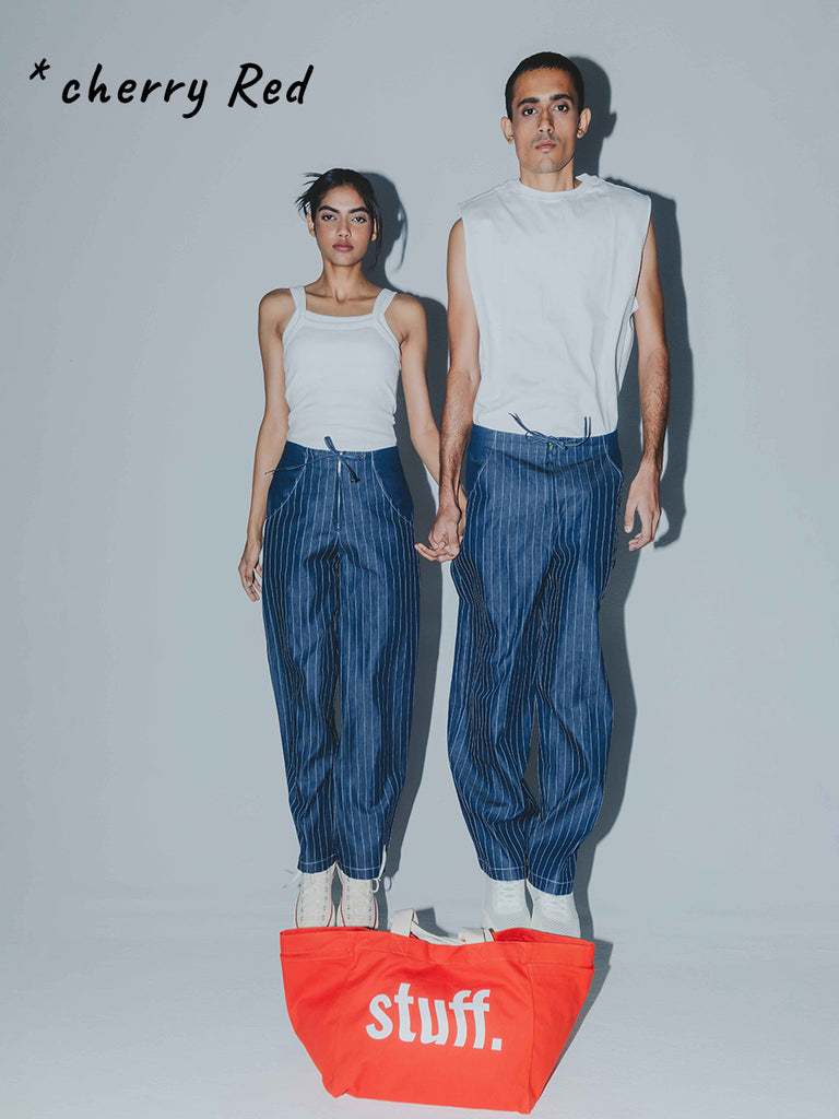 — "STUFF" graphic jhola available in just Blue & cherry Red