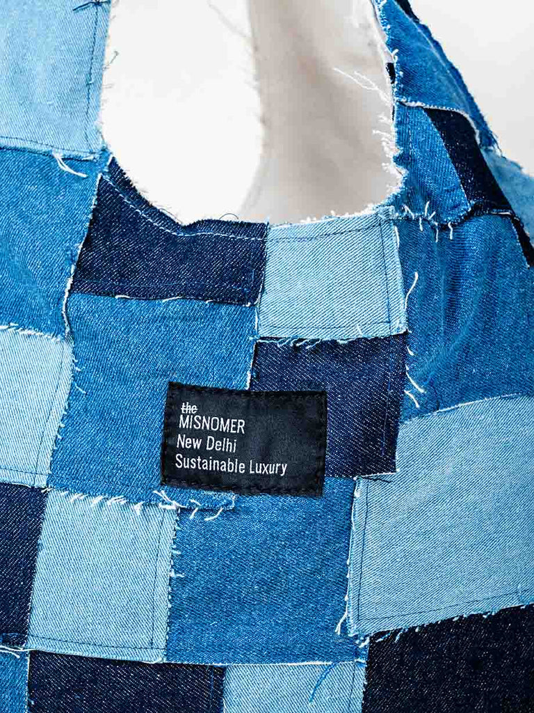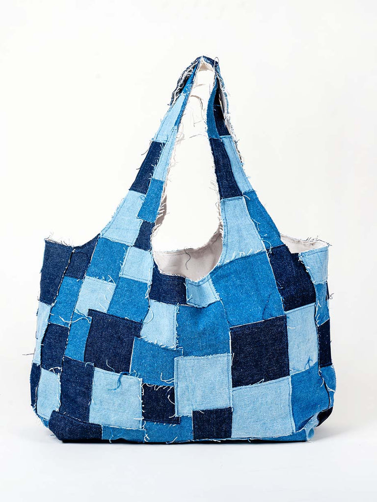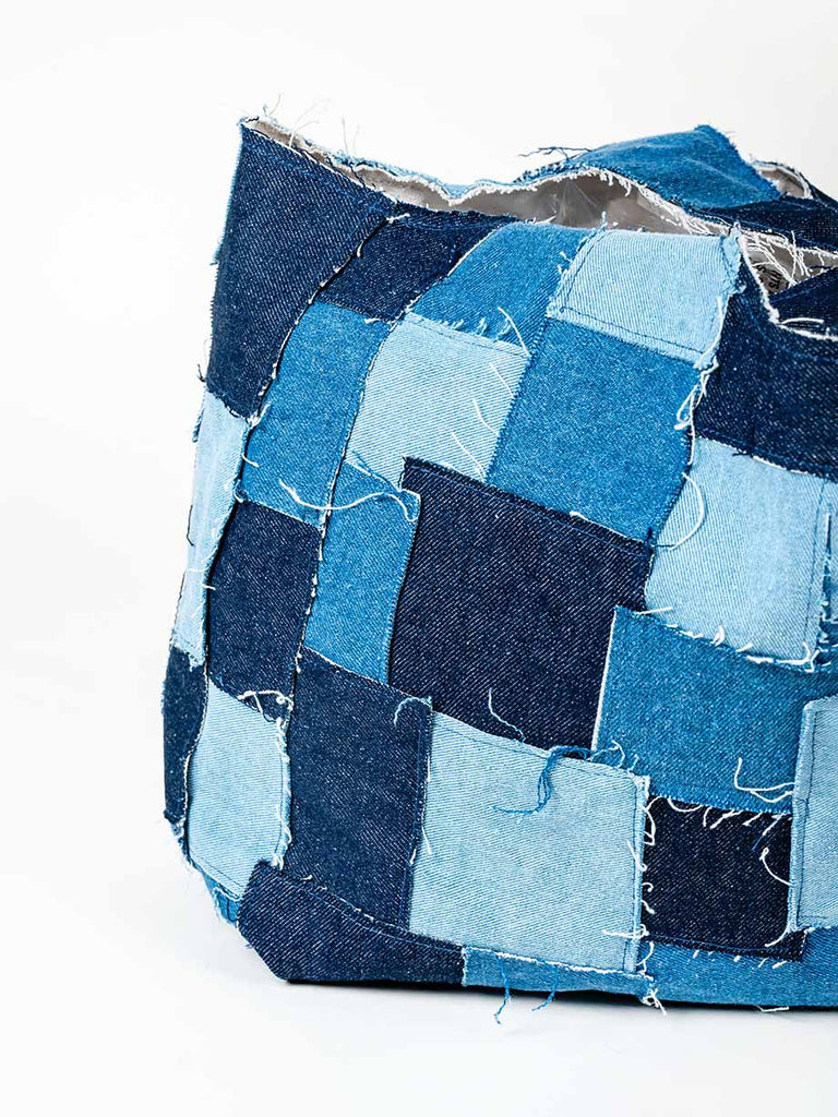 — hand-made with patchwork of denim in tonal shades of blue using leftovers from our previous collection